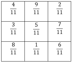 Therefore, the sum of all the numbers in each row, in each column and along the diagonals is \cfrac { 15 }{ 11 }